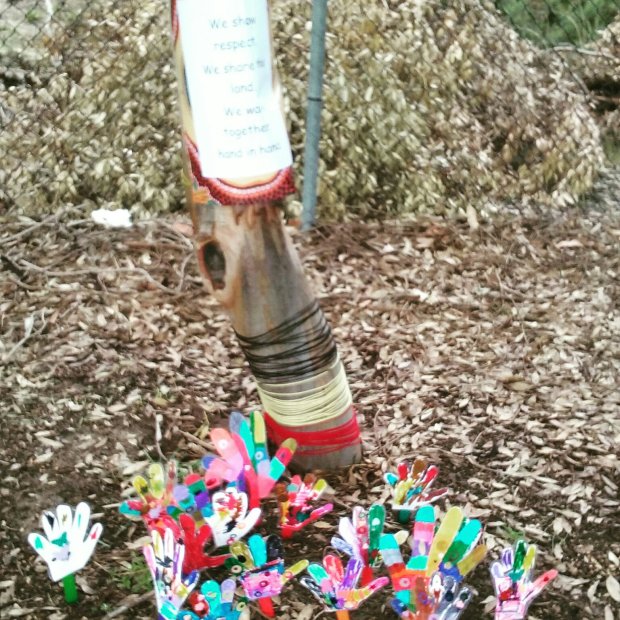 Today my kindys put together our NAIDOC display in our outdoor play area.We tied the laminated card that said: We show respect. We share the land. We walk together hand in hand. Then we tied wool around the base of the tree in the colours of the Indigenous flag. We also talked too the children about acceptance and belonging that everybody is welcome in our classroom. The kindys then put their hands that they decorated and I had laminated and put on a big popstick into the earth one by one. It was very sweet and they really were proud to have done it.