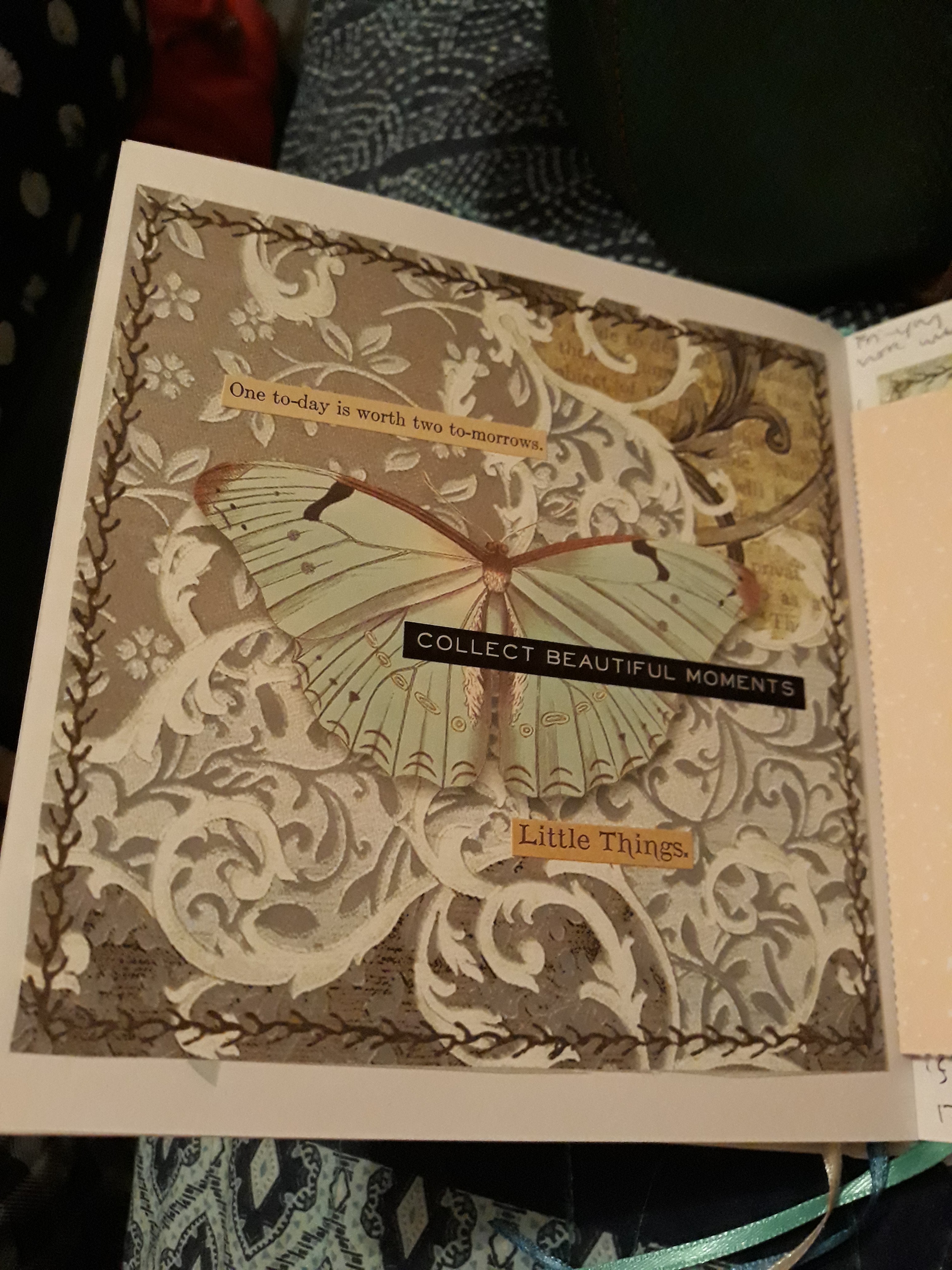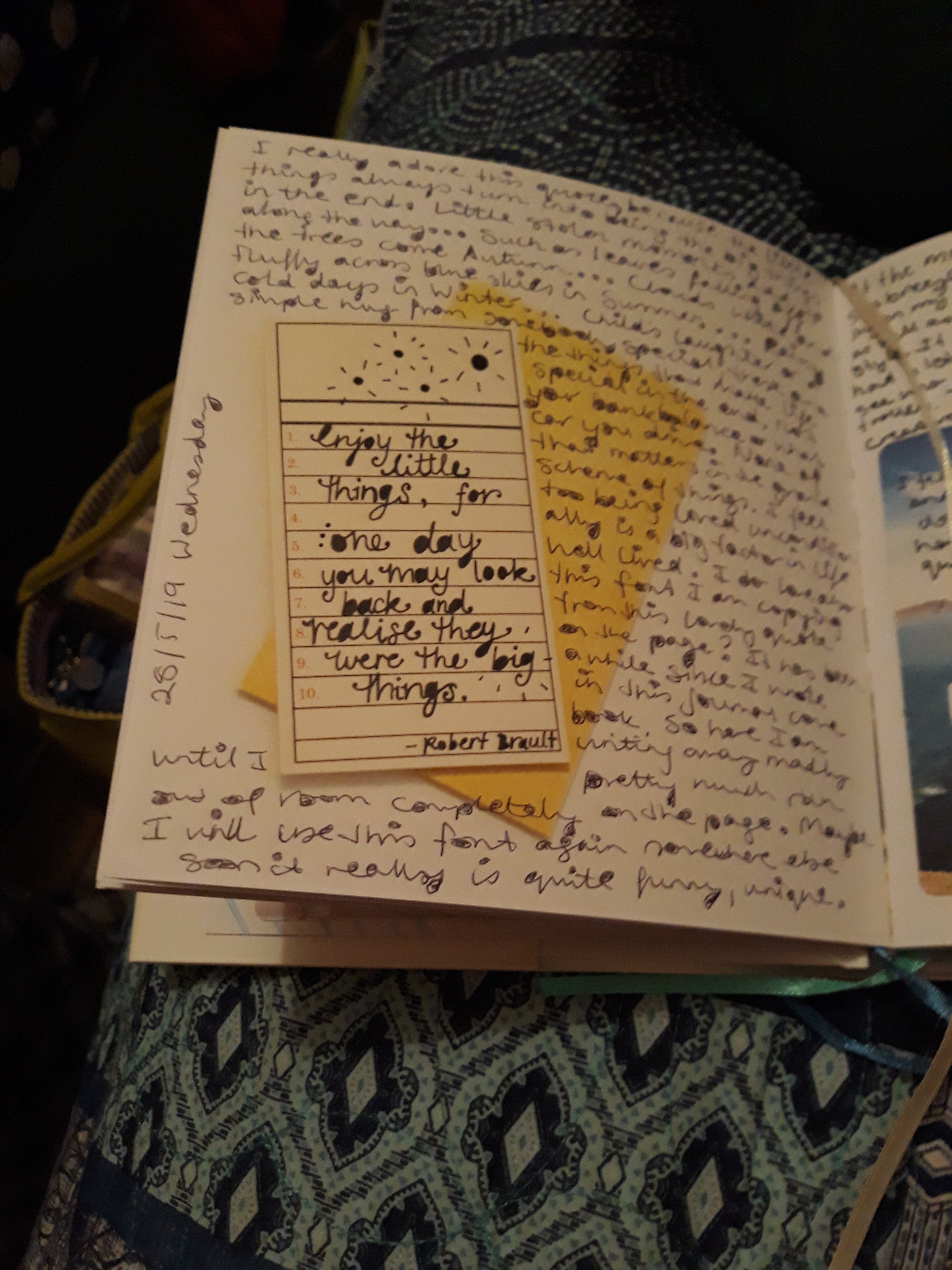 I have recently finished my repurposed journal, that I made from an old Kikki K book I got for a couple dollars in an Op shop. It has been a couple of months labour of love, and over the last month or two I had decided that I wanted to complete it. Now as of yesterday I have completely finished the last page. It makes me proud, but also sad whenever I get to this stage in any journaling project of mine. Part of me wants to finish pronto, and the other part of me simply wants to prolong the writing that I live to put in every single one of my journals. It may seem totally bonkers, but hey that is me, a little wacky of course.