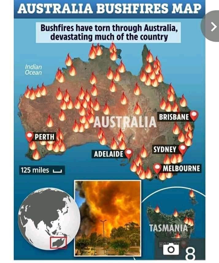 Hi may I just reassure you that Australia is not burning all over. It is true there are huge areas that are burning and other fires have been happening since September. So please be aware that there are many areas very large areas that are not burning. I do not mean to take anything away from any areas that are impacted and there are over 2000 homes destroyed. I just wish to encourage you to be aware that it is not good yet it is not all burning.