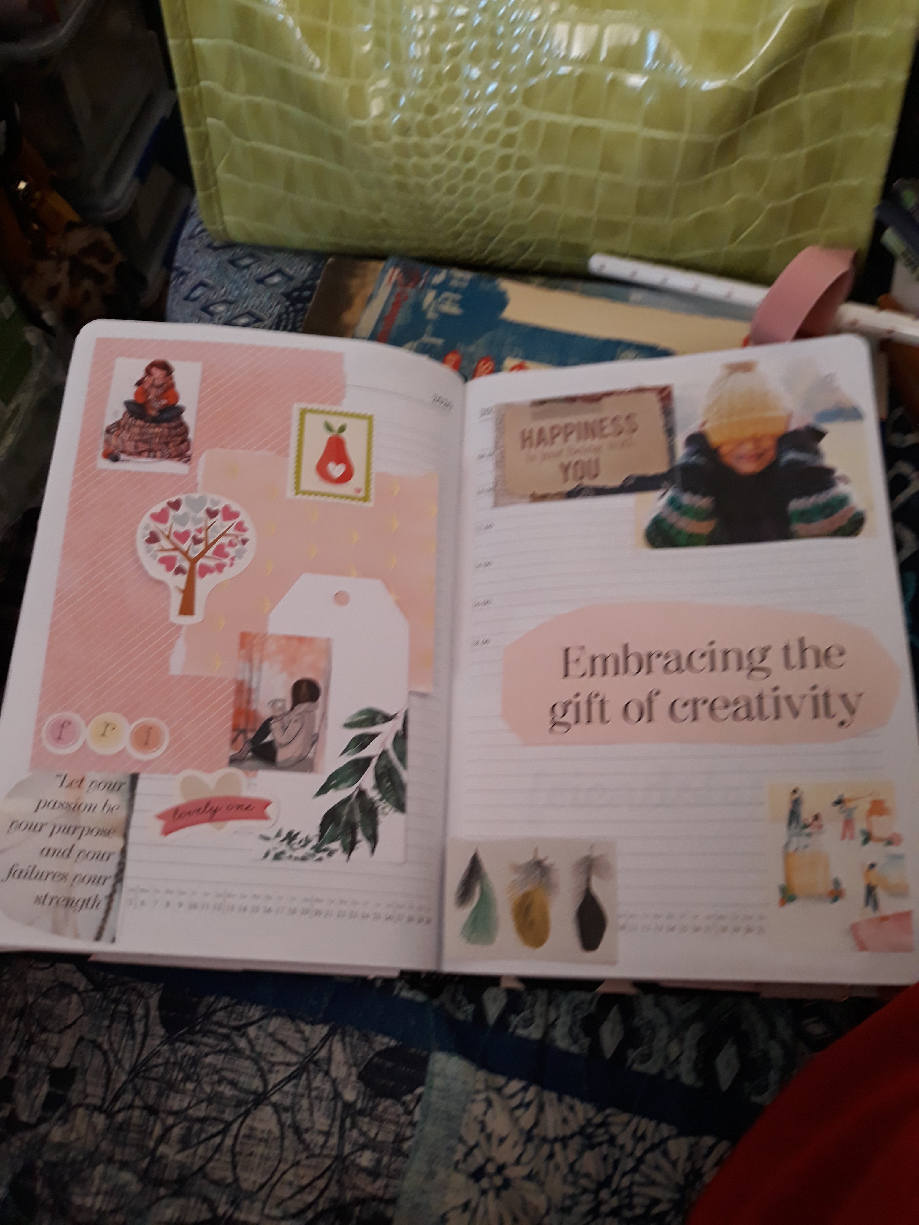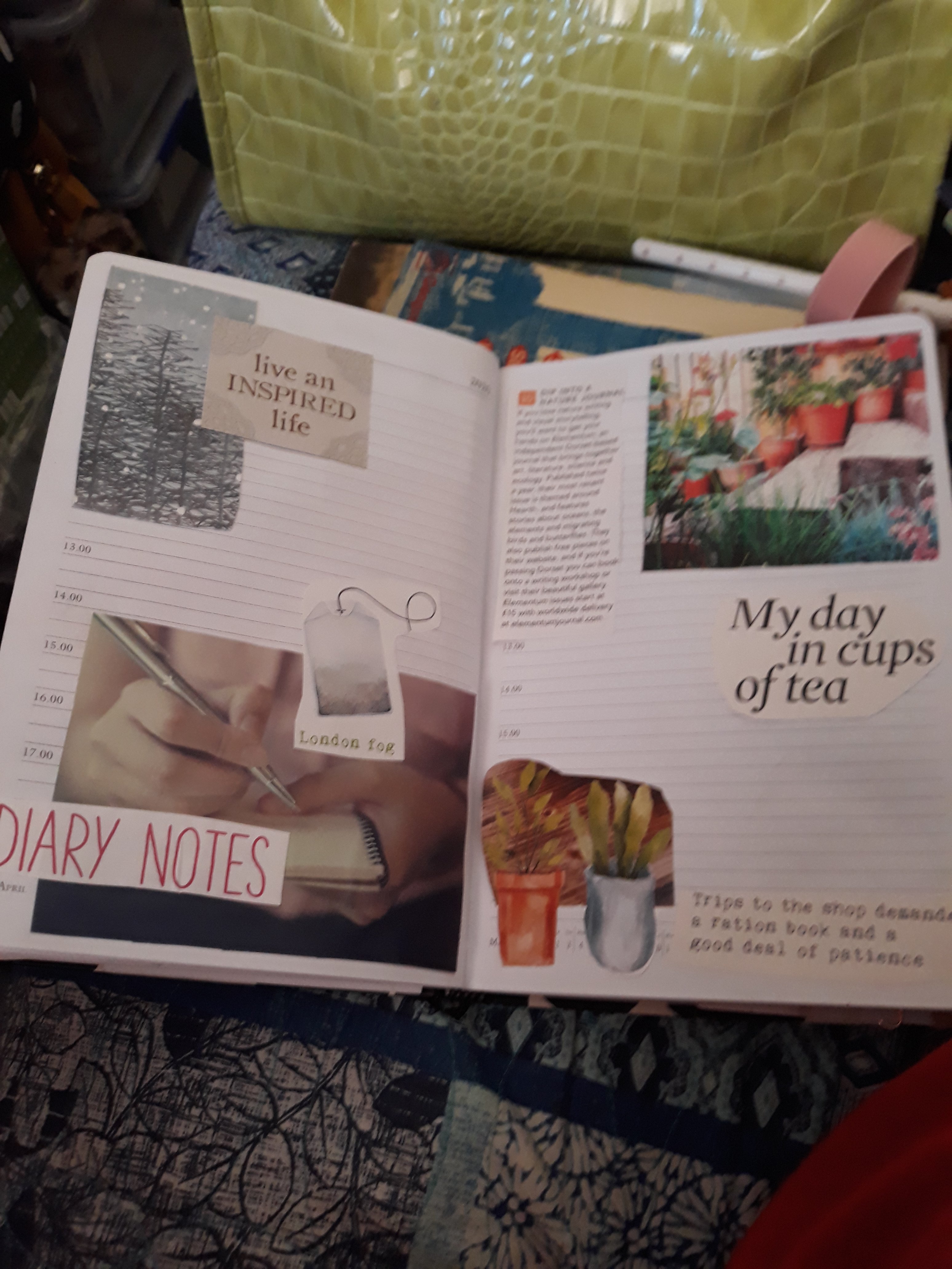 Today quiet day recovering from cleaning bathroom yesterday. Spent some time reading, as well as decorating my Fauxbonichi for coming month. I managed to use up quite a lot of collage stuff from old magazines etc. It also was quite relaxing while listening to the radio and talking with my family.