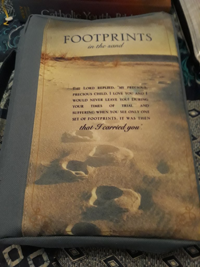 Footprints in the sand is one of my favourite verses..hence the reason behind my Bible cover having the same well loved verse. It is a constant reminder to me, that God carries me when I can no longer walk. He never abandons me or leaves me to the darkness. It is an image that sticks me my mind always, with God you can weather any storm.
